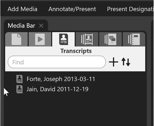 Now you will see the transcript registered under the Transcripts tab of the Media Bar. The transcript is named automatically based on the fields in the MDB or XML file for first name, last name and deposition date. If this data is incorrect, you can easily fix the ID and Name by hitting F2 and renaming.