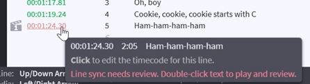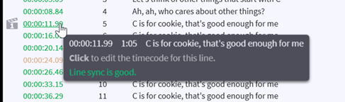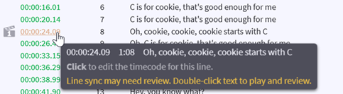 After your sync file has completed, you can review the sync and check for trouble spots by reloading the transcript into the Sync & Edit transcripts (only if you closed it). Your transcript will have Green and maybe Orange or Red. Hovering over the numbers will tell you what the colors mean. You can manually edit the times.