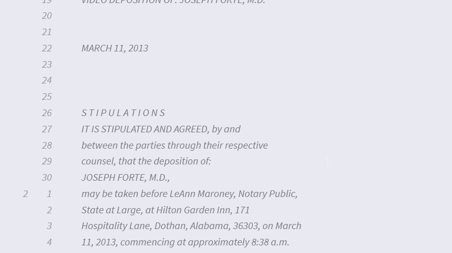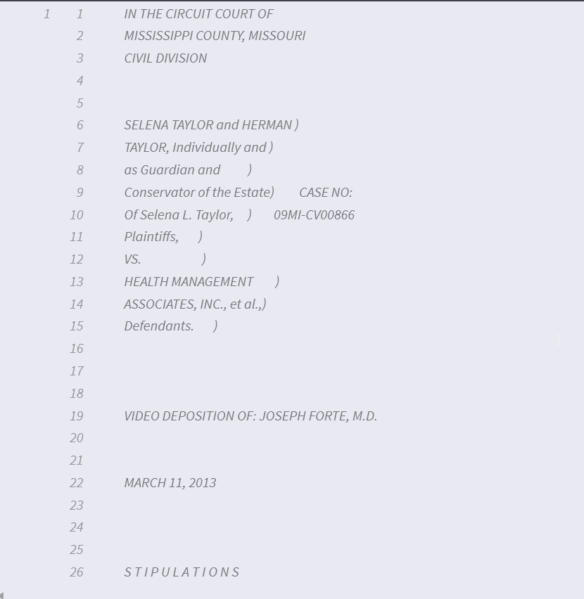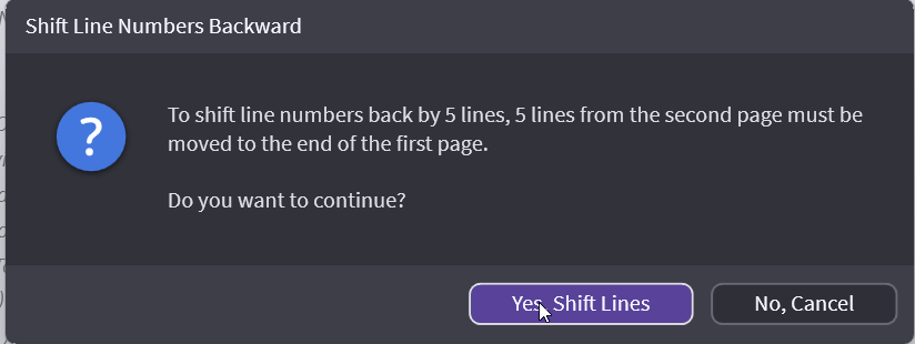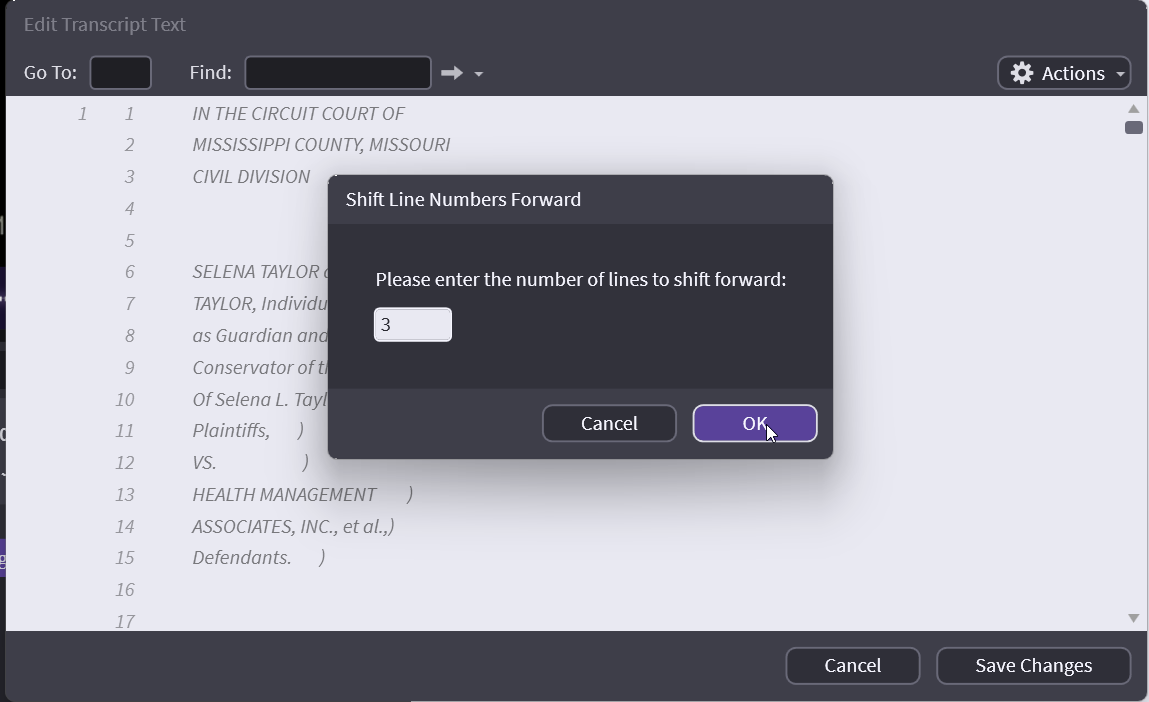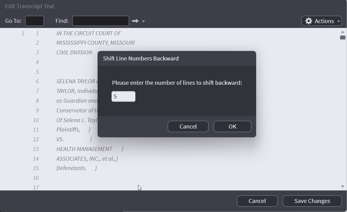 Let’s say there are somehow extra lines on the transcript your people are working with. So instead of testimony starting on page 7 line 14, their version starts on page 7 line 9. Using shift backward to keep page 1 and adds the number of lines from page 2. In the pictures below shifting 5 lines, make page 1 have 30 lines and now the testimony starts on page 7 line 9.
