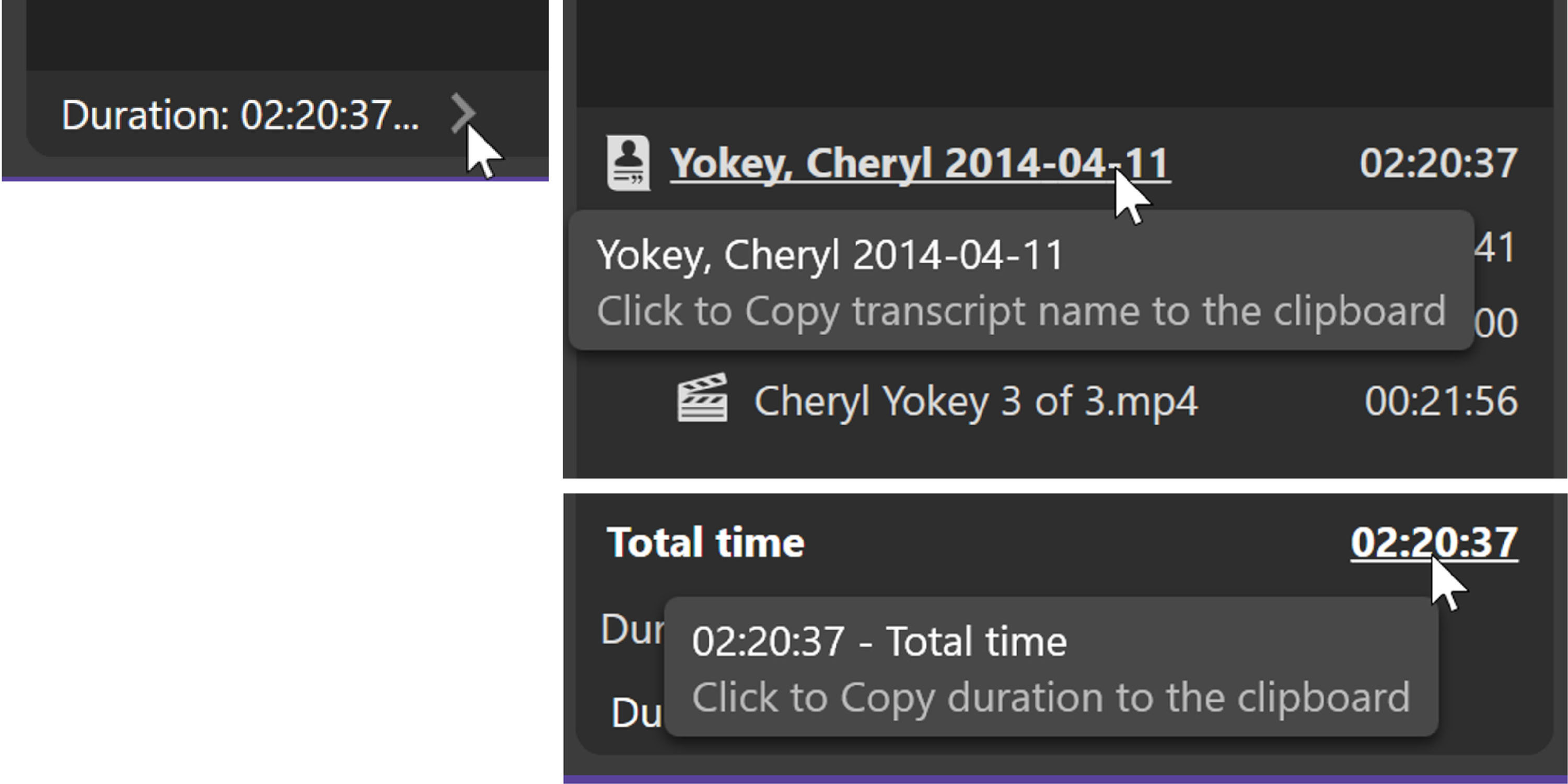 You can copy the ID if you have import files to do you can copy the total time of the deposition itself.