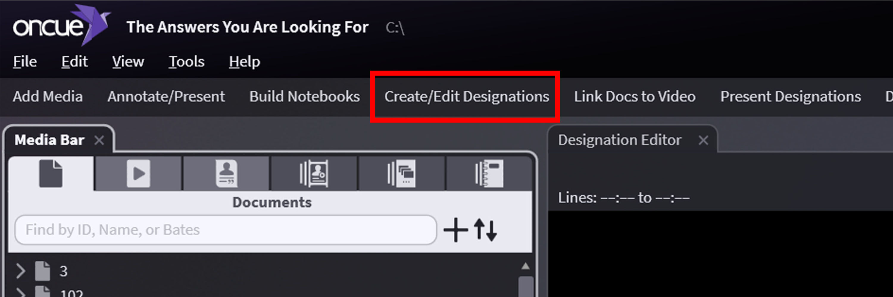 Access the pre-set screen layout for working with video depositions, click on the Create/Edit Designations on the Workflow Ribbon.