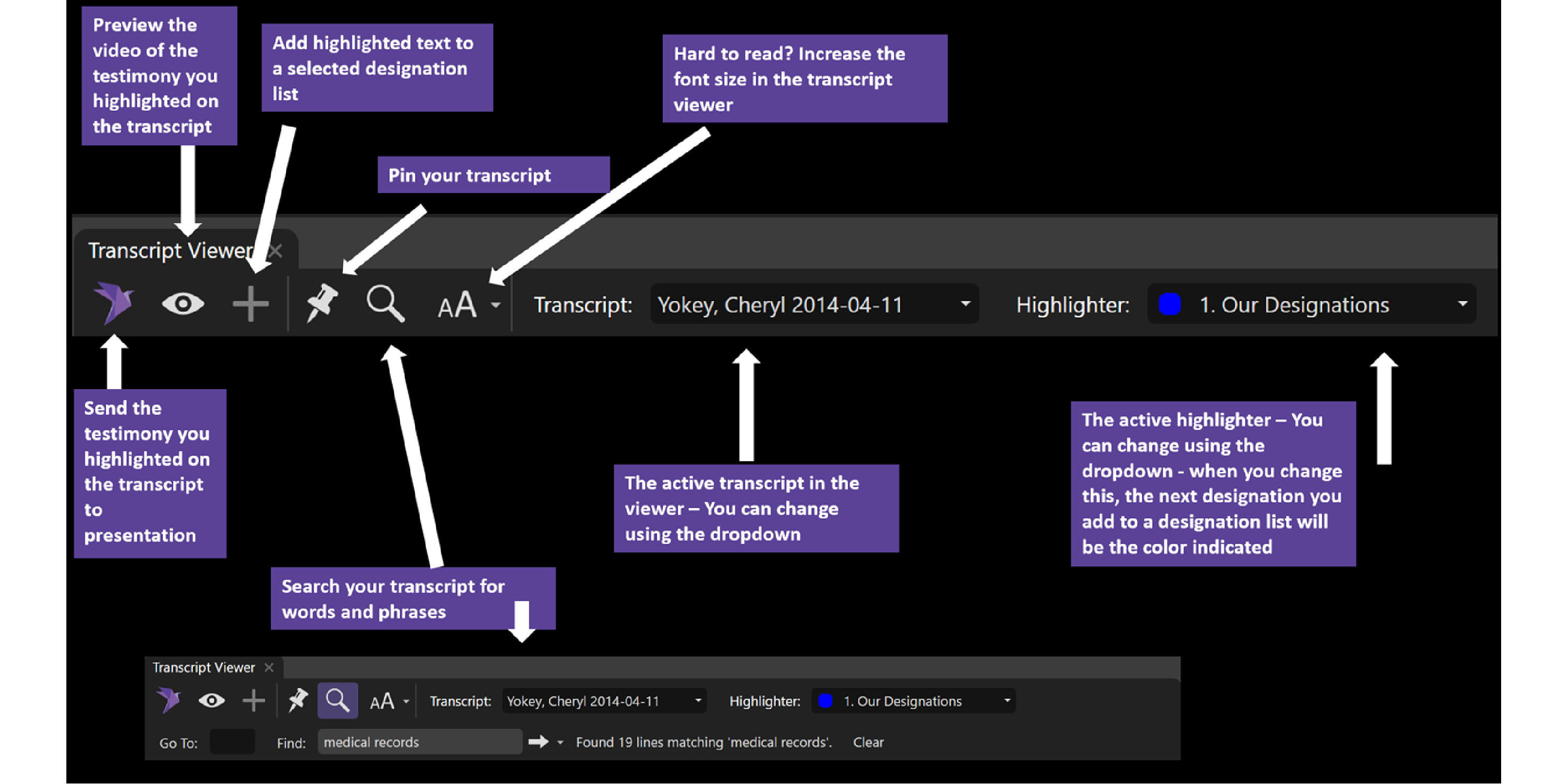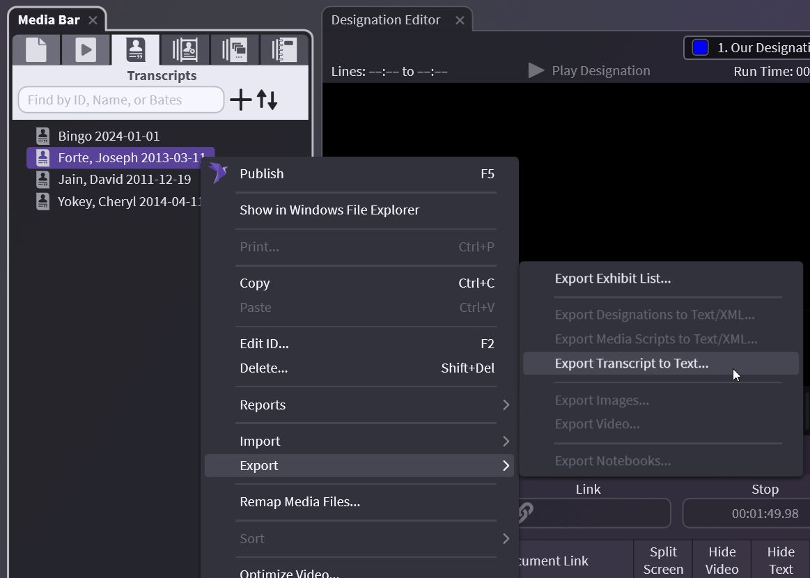 If you "pin" the Jones transcript and then click on a Smith designation, the transcript pane will remain in the Jones transcript. This is very useful when creating a Designation List or Presentation from multiple transcript sources.