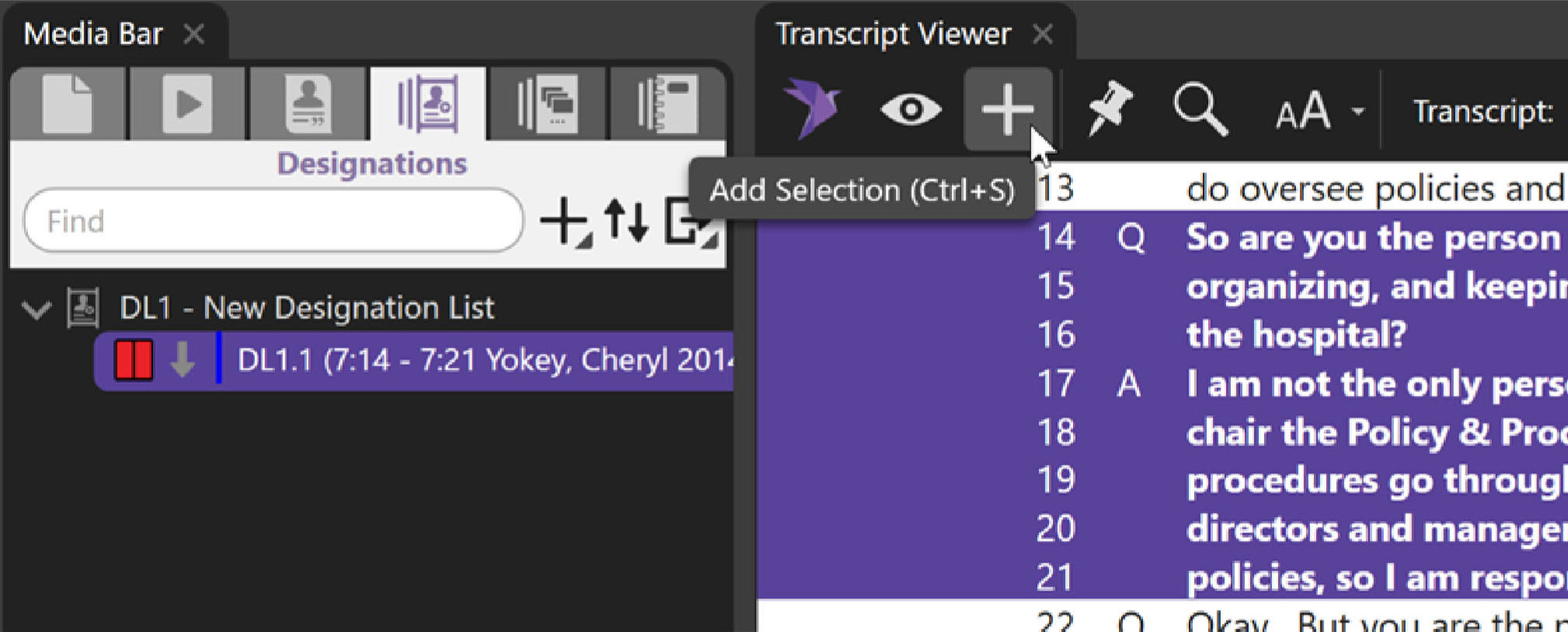 The Add Selection Button will add the text selected in the Transcripts pane to the Designation List that you have selected in the Media Bar. This feature is also accessible via the right-click menu after you've made a selection in the viewer pane.