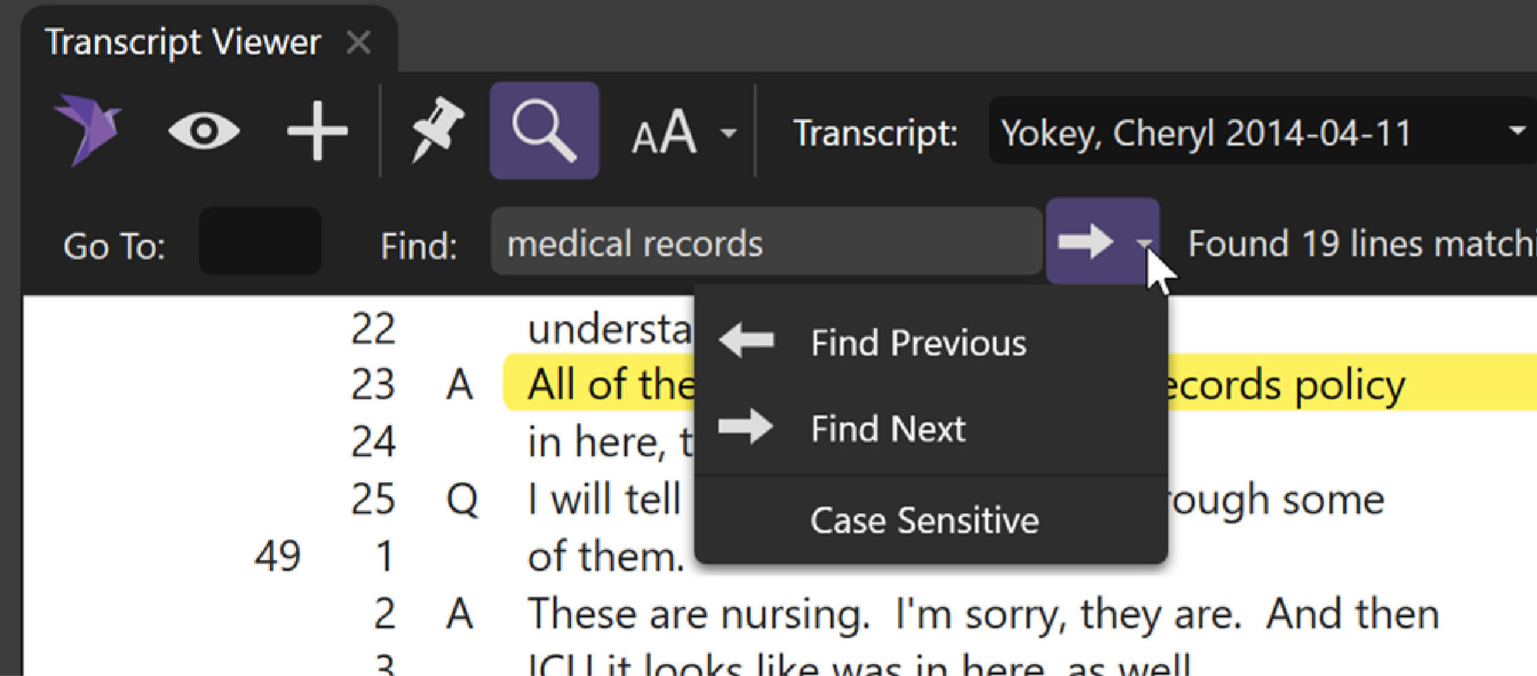 The Thumbtack Icon allows you to "pin" a transcript. When unpinned, if you click on an item in the Media Bar, the transcript will automatically change to match the selection. For example, if you're viewing the Jones transcript and then click on a Smith designation in the Media Bar, the transcript pane will automatically switch to the Smith transcript.