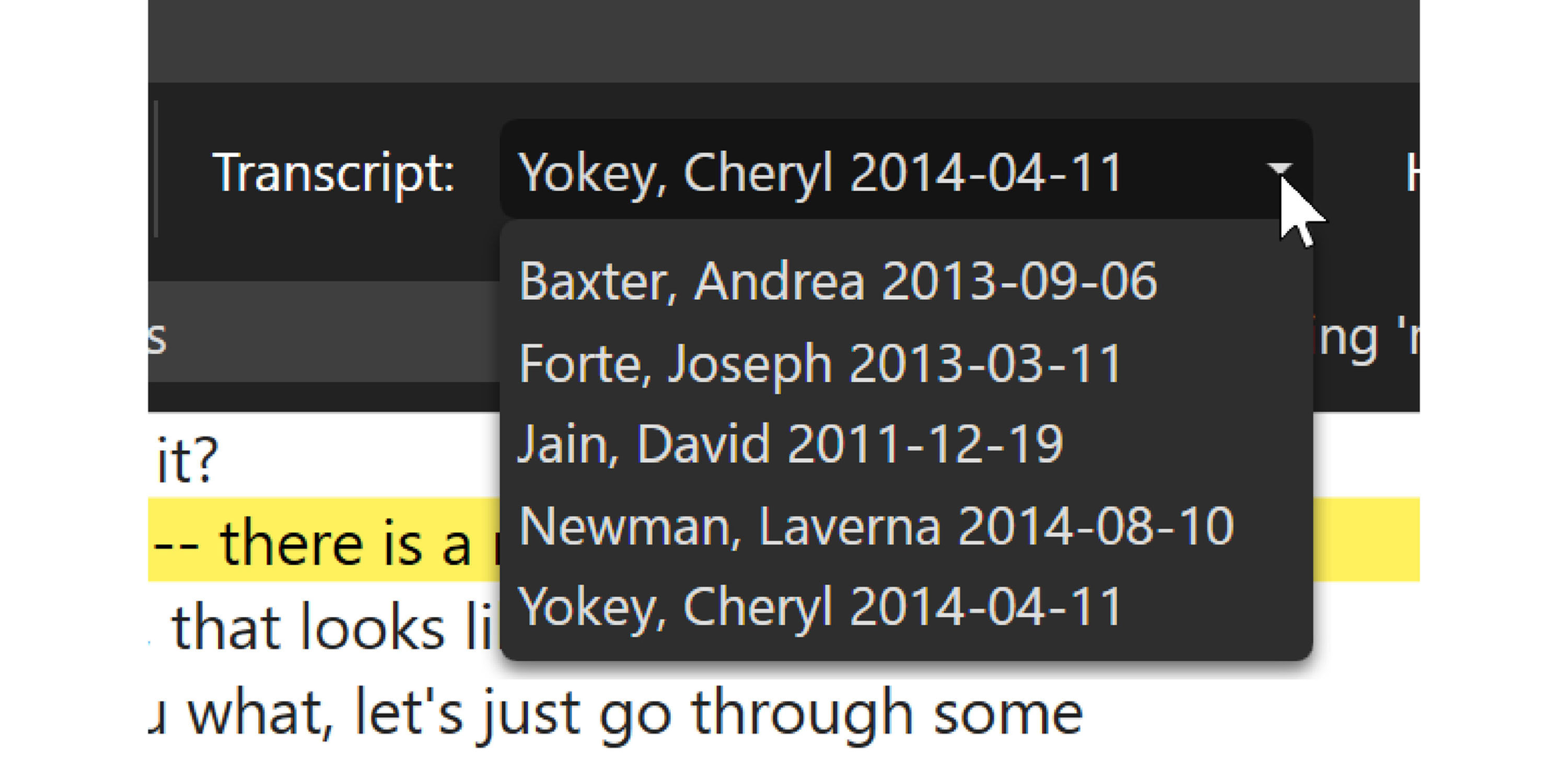 The "Transcripts" dropdown box allows you to switch to a different transcript within the Transcripts pane. Just click the box and scroll the transcripts, then click the one you would like to select.