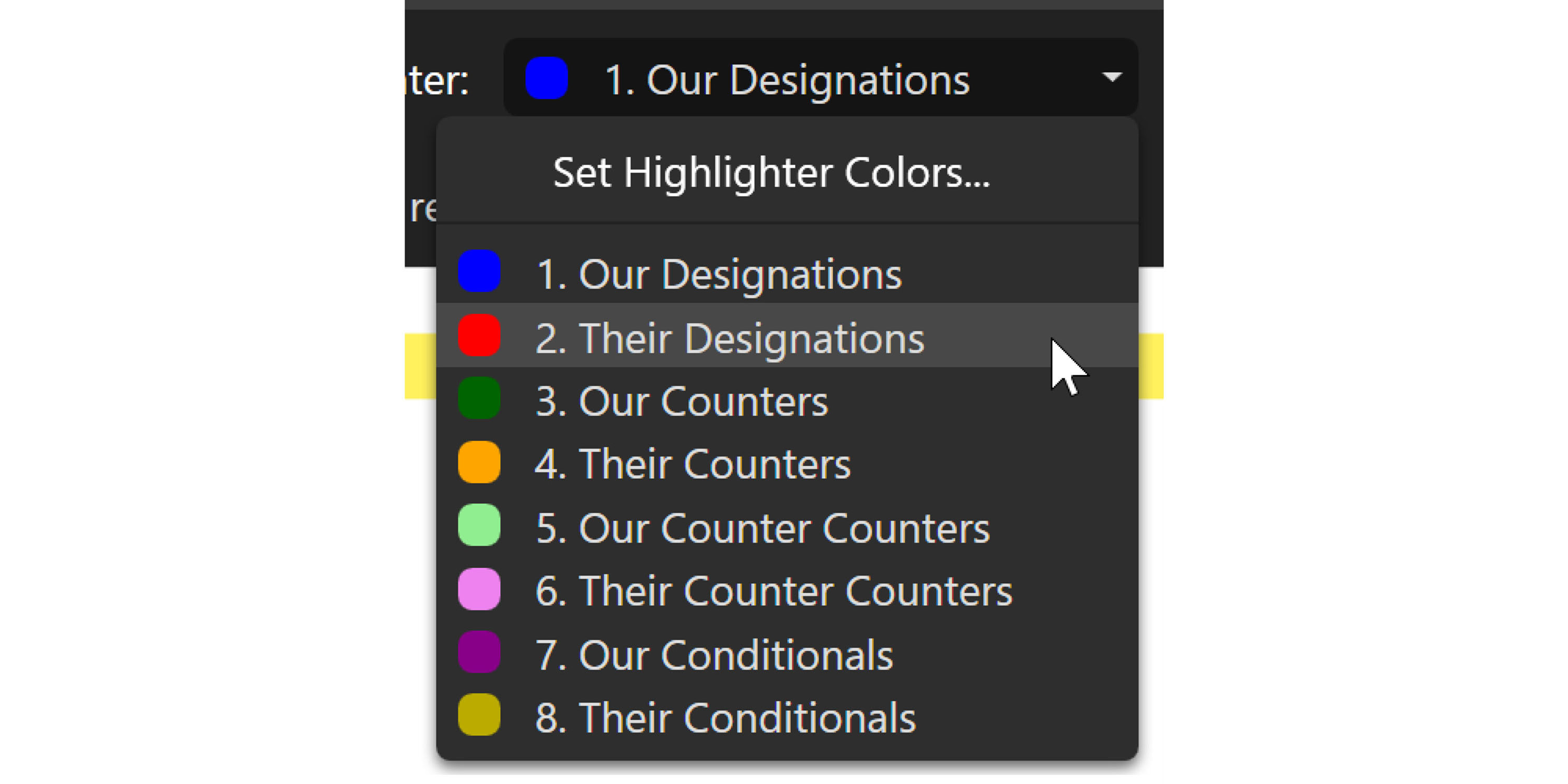 The highlighter dropdown allows you to change the color you are adding designations with. If you are on blue and want the next designation you highlight to add to a list to be a different color, just change it here.