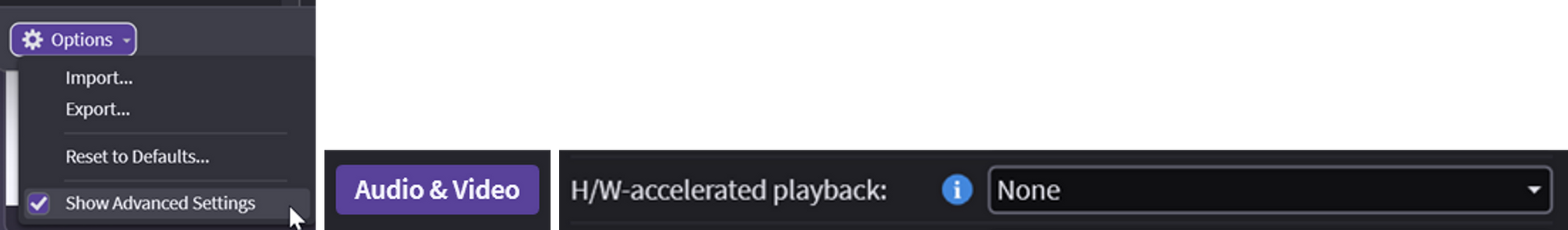 :::info Solution 2 Check your Advanced Settings. Go to Edit > Preferences, in the bottom left corner under Options and then under Audio & Video, make sure all the H/W Accelerated playback is set to None.